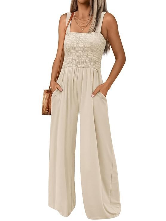- Design: Loose fit overalls for women, fashionable pants,baggy style, v-neck design, sleeveless rompers ,casual summer outfits, with two sides pockets,solid color,standard size,suit for summer vacation, makes you look very chic.This jumpsuit features a stretchy smocked design at the bust and an ultra wide leg silhouette.
