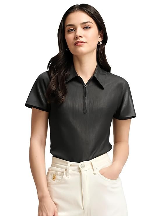 Mack Jonney Ribbed |Regular Fit | Half Sleeves 100% Cotton Polo Neck Self Design with Zip T-Shirt for Women-M919