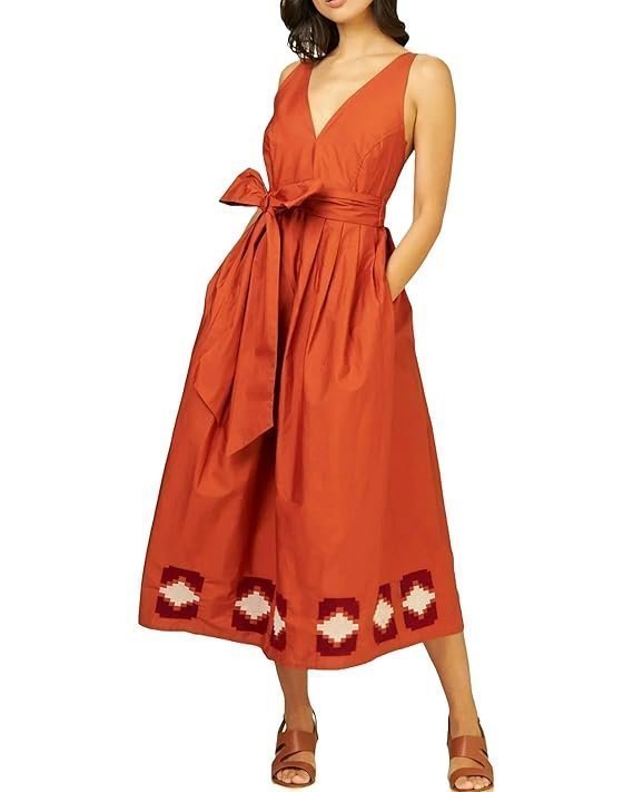 - Delicate embroidery on the hem adds a touch of sophistication to the calf length dress.