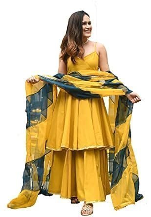 - Style : Solid Mustard Yellow Anarkali Kurta With Sharara Pants And Dupatta